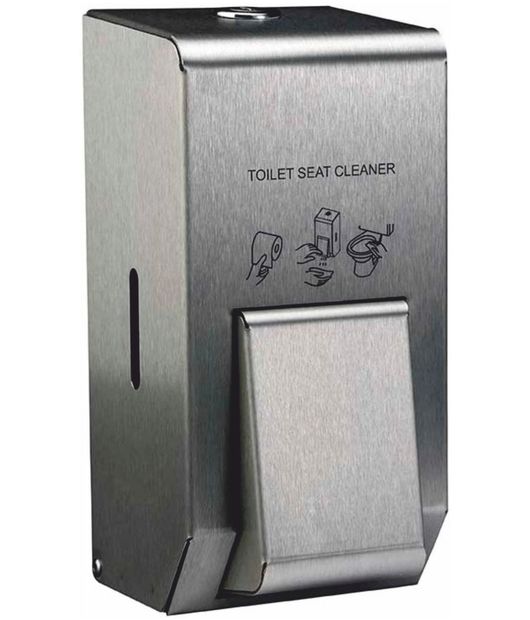 The dispenser has hard wearing digitally printed wording and simple user instruction images. It is intended to be wall fixed next to a toilet tissue dispenser for ease of operation. The user is able to wipe any surfaces they choose, including the seat, flush, and cubicle door handle.