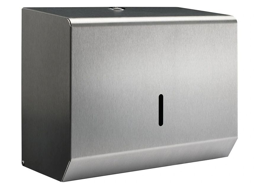 A modern and stylish hand towel dispenser finished in a brushed stainless. The unit is designed for usage in areas with restricted spaces.